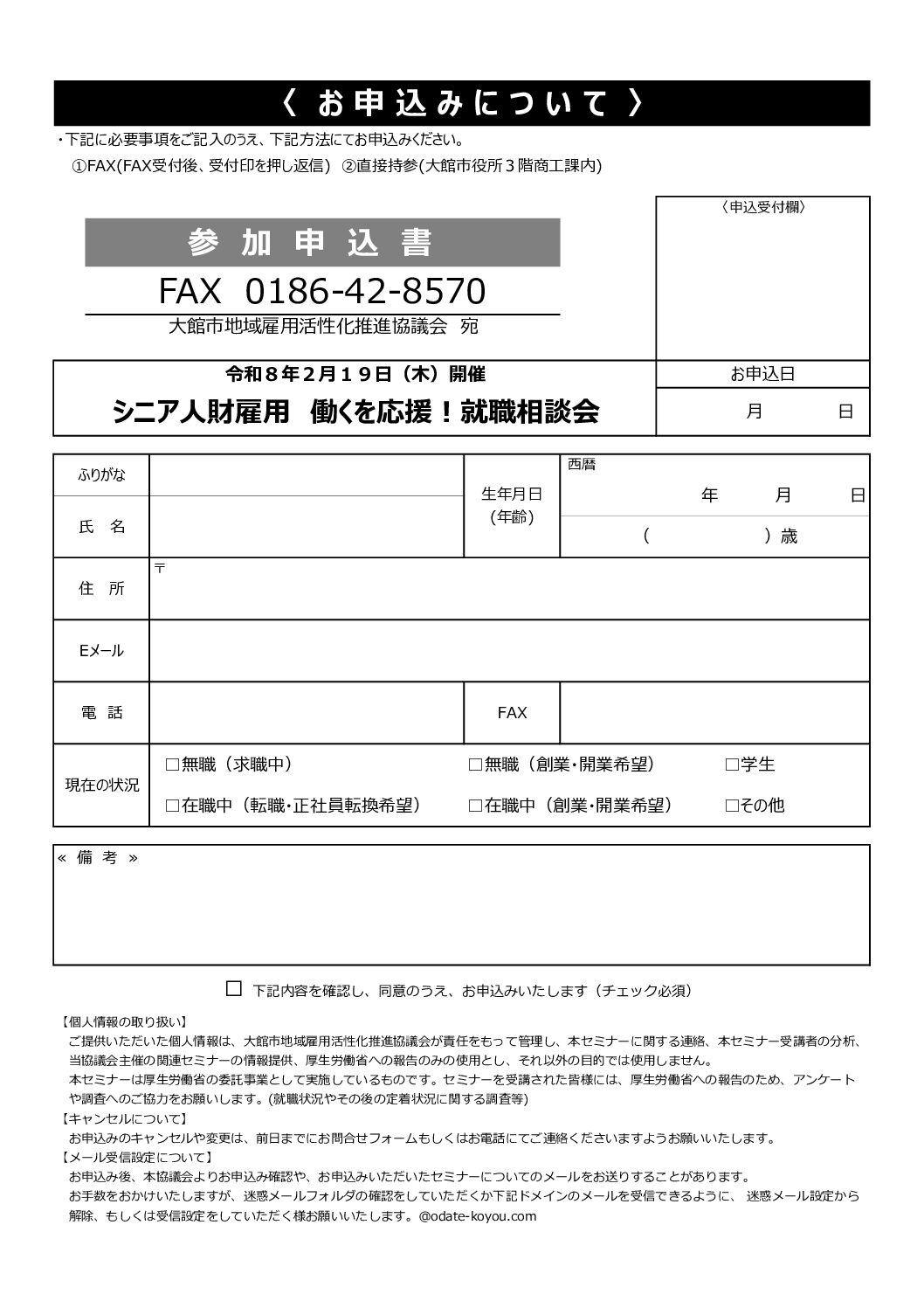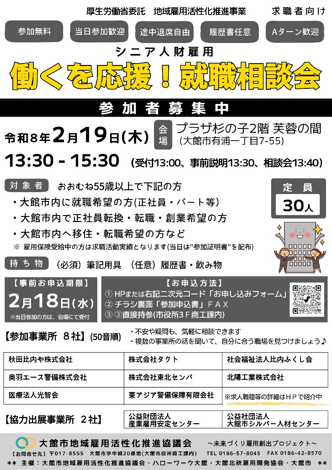 受付中 イベント 【2026年2月19日(木)】(求職者向け)シニア人財雇用 働くを応援!就職相談会 ■開催日時:2026年2月19日(木)【受付開始】13時00分 【説明・相談会】13時30分開始 15時30分終了 ■受付期間:2026年1月21日(水)15時 〜 2026年2月18日(水)17時 \ 参加事業所8社&協力出展2社 参加事業所の「求人中の職種・ひとこと」はこちら / 事業所担当者と直接話ができるチャンスです!大館市で働きたいと思っている、おおむね55歳以上の方なら、どなたでも参加できます。・複数の事業所への相談が可能・求職中・転職希望・まだ迷っている方もOK・家族や友達と一緒の参加も可能少しでも気になることがあれば、ぜひご相談ください。相談会を通じて、情報収集や面接準備にお役立ていただけますので、この機会をぜひご利用ください。。皆様のご参加お待ちしてます♪ PDFダウンロード 開催日時 2026年2月19日(木)【受付開始】13時00分 【説明・相談会】13時30分開始 15時30分終了 受講料 無料 定員 30名 開催場所 プラザ杉の子 2階 芙蓉の間 (秋田県大館市有浦一丁目7-55) 講師 ー 申込方法 ①下記お申込みフォーム ②チラシ(裏)「参加申込書」FAX ③チラシ(裏)「参加申込書」直接持参(大館市役所3F商工課内) 申込期間 2026年1月21日(水)15時 〜 2026年2月18日(水)17時 その他 【持ち物】(必須)筆記用具 (任意)履歴書・飲み物 【その他】 参加無料、当日参加歓迎、履歴書任意、Aターン歓迎、途中退席自由(入場・退場の管理はさせていただきます) Seminar お申し込みフォーム ※開催日前日まではお申し込みが可能です(当日参加歓迎ですが、事前申込いただけますと幸いです) ※当日参加の方は、会場にて受付いたします ※アンケート(当日・開催後)へのご協力をお願いします お名前 ふりがな 郵便番号 〒 住所 生年月日 1945194619471948194919501951195219531954195519561957195819591960196119621963196419651966196719681969197019711972197319741975197619771978197919801981198219831984198519861987198819891990199119921993199419951996199719981999200020012002200320042005200620072008200920102011201220132014201520162017201820192020202120222023202420252026 年 123456789101112 月 12345678910111213141516171819202122232425262728293031 日 メールアドレス 電話番号 現在の状況 無職(求職中)無職(創業希望)在職中(転職、正社員転換希望)在職中(創業希望)学生その他 備考 【個人情報の取り扱い】 ご提供いただいた個人情報は、大館市地域雇用活性化推進協議会が責任をもって管理し、本セミナーに関する連絡、本セミナー受講者の分析、当協議会主催の関連セミナーの情報提供、厚生労働省への報告のみの使用とし、それ以外の目的では使用しません。 本セミナーは厚生労働省の委託事業として実施しているものです。セミナーを受講された皆様には、厚生労働省への報告のため、アンケートや調査へのご協力をお願いします。 (雇用・就職状況やその後の定着状況に関する調査等) 【キャンセルについて】 お申込みのキャンセルや変更は、前日までにお問合せフォームもしくはお電話にてご連絡くださいますようお願いいたします。 【メール受信設定について】 お申込み後、本協議会よりお申込み確認や、お申込みいただいたセミナーについてのメールをお送りすることがあります。 お手数をおかけいたしますが、迷惑メールフォルダの確認をしていただくか下記ドメインのメールを受信できるように、迷惑メール設定から解除、もしくは受信設定をしていただく様お願いいたします。 @odate-koyou.com 上記内容を確認し、同意のうえ、お申込みいたします